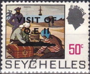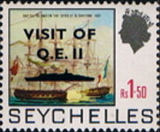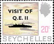 20-, 50-, 95-cent and 1.50-rupee stamps overprinted with silhouette of Cunard Steamship Company's Queen Elizabeth 2 ocean liner/cruise ship.