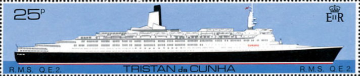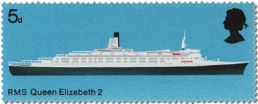 5-pence stamp depicts the Cunard Lines' Queen Elizabeth 2 ocean liner/cruise ship.