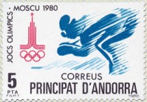 5-peseta stamp depicts downhill skiing on a stamp commemorating the 1980 Summer Olympics in Moscow.
