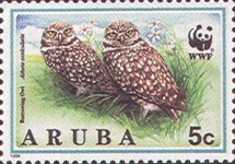 5-cent stamp depicts the burrowing owl (Athene cunicularia arubensis) misspelled as "conicularia".