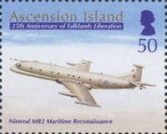 50-pence stamp depicts Nimrod MR2 Maritime Reconnaissance fighter jet with error in caption as "Reconaissance".