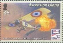 35-pence stamp commemorates 100th anniversary of British naval aviation, misspells airplane Morane-Saulnier I as "Moraine-Saulnier I".
