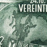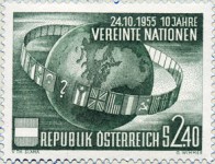2.40-schilling stamp marks 10th anniversary of United Nations, showing flags circling the globe. But, what planet is this? The continents of Earth do not exist like this.