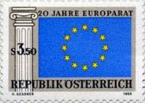 3.50-schilling stamp depicting the flag of the Council of Europe, upside-down, as a single point should be at the top of each star.