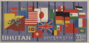 33-chetrum, 1-ngultrum, and 3-ngultrum stamps depict incorrect United Kingdom Union Jack flag.