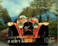 10-chetrum stamp depicts Alfa Romeo car, misspelled "Rameo".
