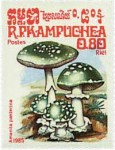 80-cent stamp depicts Amanita pantherina mushrooms misspelled "Amanita panterina", showing green caps on the mushroom instead of brown, and smooth stems lacking concentric rings.