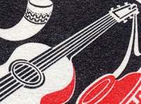 1.15-escudo stamp depicts what should be a 6-string guitar, but whether you are counting white or black, one string disappears temporarily in the center hole, which is also on top of the strings.