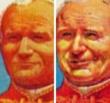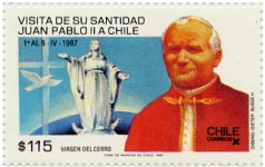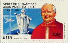 115-peso stamp depicts Pope John Paul II and Virgin of the Hill; soon re-issued with halo on statue and smiling Pope.