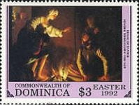 $3 stamp depicts painting The Denial of Saint Peter by Hendrick ter Brugghen, but the image is flipped left-right.