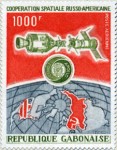 1000-franc stamp depicts USA and USSR space crafts docking, over a partial globe of the Earth, omitting Great Britain and Ireland.
