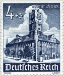 4+3-pfennig semi-postal stamp depicts the town hall of Thorn, but the image is flipped left-right (statue should be left of center, entrance doors should be on left side).