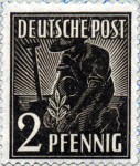 2-pfennig stamp depicts the Sun's rays in the background, but one the rays past the shovel handle does not exist on the other side.