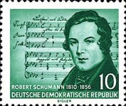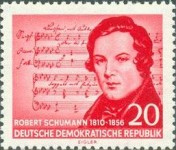 10-pfennig and 20-pfennig stamps depict composer Robert Schumann with composition by Franz Schubert in the background. Corrected versions were released three months later.