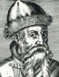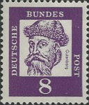 8-pfennig stamp depicts reversed image of engraving of Gutenberg, should face right as in source 16th century copper engraving.