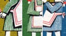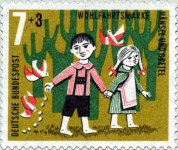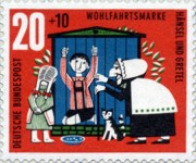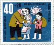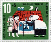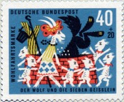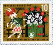 10+5-pfennig and 40+20-pfennig semi-postal stamps depict scenes of story The Wolf and the Seven Kids; from the first stamp to the last, the mother goat's clothes change from green-striped top and skirt with red crosses to yellow-striped top and skirt with blue crosses, plus other smaller changes in colors.