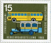 15-pfennig stamp depicts a yellow bus that must have been printed facing the wrong direction, as Germany drove on the right-hand side in 1965, so this bus would have let passengers out in the middle of the road.