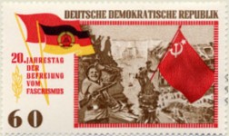 60-pfennig stamp depicts Yevgeny Khaldei's photo of Russian soldiers raising the Soviet Union flag on the German Reichstag, but the image is reversed left-right.