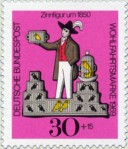 30+15-pfennig semi-postal stamp depicts a bird seller, with bird drawn on outside of one cage.