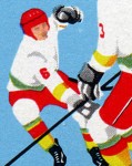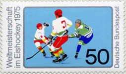 50-pfennig stamp depicts three ice hockey players, but one hockey stick is missing.