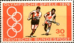 30+15-pfennig semi-postal stamp depicts two men playing field hockey, but the image is reversed, as they should have their left hands at the top of the sticks.