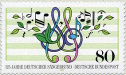 80-pfennig stamp depicts various musical symbols, but the score sheet in the background has six lines instead of five.