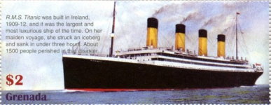 $2 stamp depicts ship Cunard line's RMS Titanic passenger liner with smoke coming from all four funnels, but the rear funnel was non-functional.