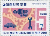 7-won stamp depicts three cog wheels interlocking, meaning they will never move.