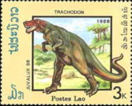 3-kip stamp depicts a Tyrannosaurus dinosaur, mislabelled as "TRACHODON"; 50-kip stamp depicts a Trachodon mislabelled as "TYRANNOSAURUS".