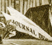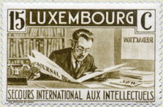 15-centime semi-postal stamp depicts a journalist reading a newspaper, with the title printed on the last page, rather than the first.