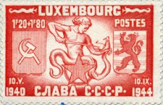 1.20+1.80-franc semi-postal stamp depicts the Communist hammer and sickle symbol flipped left-right.