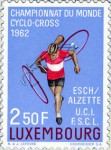 2.50-franc stamp depicts man carrying bicycle for International Cross-country Bicycle Race, but the bicycle has no brakes, no gears, and no spokes.