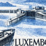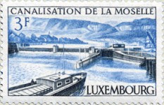 3-franc stamp depicts a barge about to enter the lock at Grevenmacher Dam, but the water level in the lock is still high, the door is closed, and the ship is moving toward it!