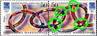 Two 50-denar stamps depict what is assumed to be stylized 5 Olympic rings made of country flags. But the ring intersections on the second stamp are incorrect in the four marked areas.