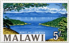5-shilling stamp depicts Monkey Bay and Lake Nyasa (as in the caption) or Lake Malawi. Malawi claims one name, neighbors claim the previous name. In 1965 Malawi re-issued this same stamp with the name changed to "Lake Malawi".