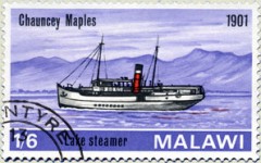 1-shilling 6-pence stamp depicts the Chauncy Maples steamer, misspelling it "Chauncey".