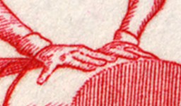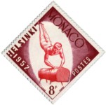8-franc stamp depicts gymnastics athlete performing impossible or very painful spreading of fingers.