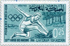 25-centime stamp depicts cross-country runner and commemorates the 53rd International Cross-country Race, and includes the Olympic Games five-ring logo, which should not be there.
