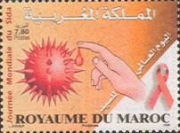 7.80-dirham stamp depicts a finger bleeding from touching a spiky representation of the human immunodeficiency virus, but the virus protrusions are not spiky, and the disease is not spread by blood from a finger prick.