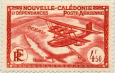 6 stamps (65-centime through 50-franc, 1938-40) depict a floatplane over New Caledonia, casting a shadow several multiples larger than the plane itself.