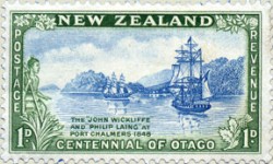 1-penny stamp for the 100th anniversary of Otago Province settlement depicts a ship at anchor *and* at full sail.