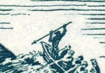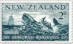 2-pence stamp depicts whalers about to harpoon a whale, but with no rope attached to the harpoon, the whale will get away.