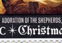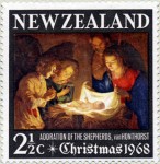2 1/2-cent stamp depicts Adoration of the Child by Gerrit Van Honthorst, but erroneously captions it "Adoration of the Shepherds".