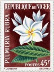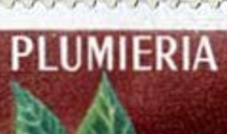 45-franc stamp depicts red jasmine (Plumeria rubra) misspelled as "PLUMIERIA RUBRA".