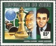 85-franc stamp depicts Anatoli Karpov with caption misspelled "Kaprov".