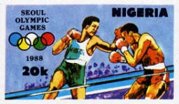 10-, 20-, 30-kobo stamps commemorate the 1988 Summer Olympic Games in South Korea, but incorrectly use the Olympic five-ring logo with filled in colors. Four of the colors are correct for the ring placements, but the white ring should be filled with black to follow the others.