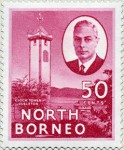 50-cent stamp depicts the clock tower at Jesselton, with incorrect caption "JESSLETON". The mistake was corrected on re-issue in 1952.