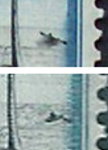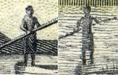 1/2- and 9-pence stamps depict a man in a canoe, but flipping over his reflection reveals an incorrect reflection of his right arm.