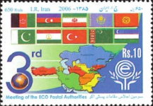 10-rupee stamp marks the 3rd meeting of the ECO postal authorities; the design was copied from the Iranian stamp, and erroneously kept the denomination, release date, and country name.