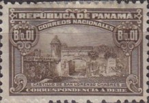 1-centesimo postage due stamp depicts the main gate of San Geronimo Castle, Portobelo, but was intended to show a gate of San Lorenzo Castle, Chagres.